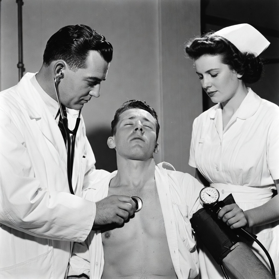 A male doctor in a white coat uses a stethoscope on a young male patient's bare chest while a female nurse takes his blood pressure with a sphygmomanometer. The patient sits on a medical bed with eyes closed in a hospital room. The black and white photograph captures a vintage medical examination scene.