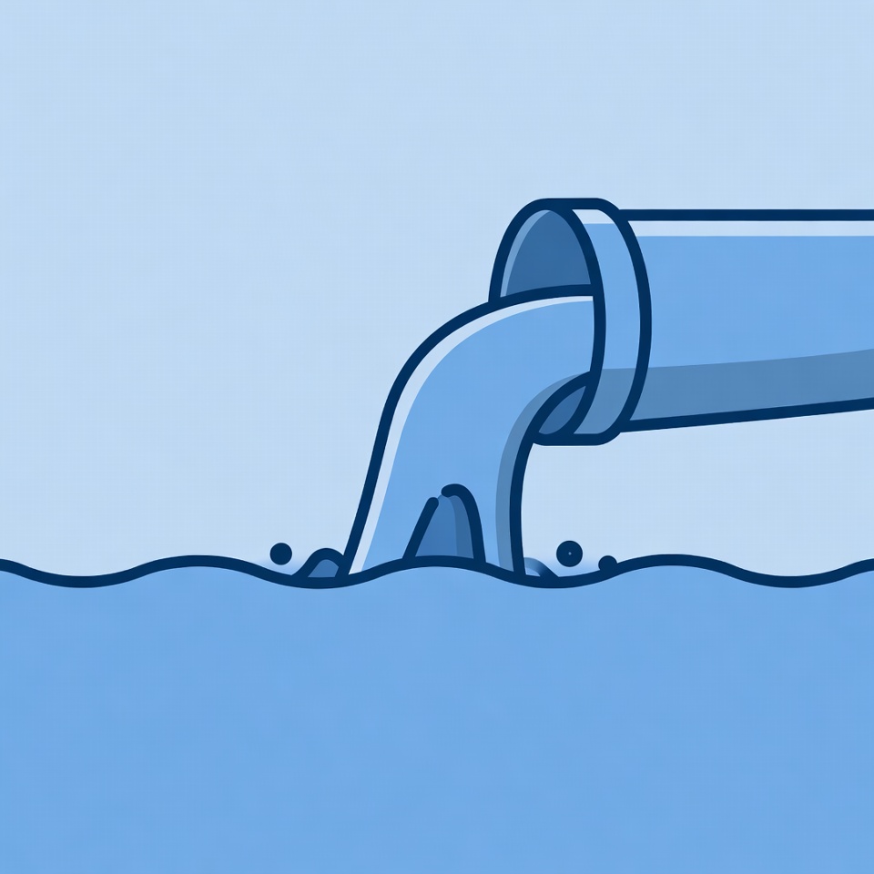 A simple blue line art illustration shows a curved pipe pouring water into a wavy body of water below. The pipe and water are depicted in solid blue outlines on a light blue background. Small splashes appear where the water meets the surface.