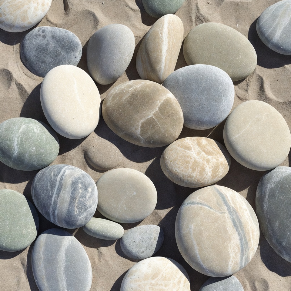 A collection of smooth pebbles in various colors including white, gray, green, and beige lies scattered on a sandy beach. The stones exhibit natural textures and rounded shapes. Sunlight highlights their surfaces against the fine sand background.