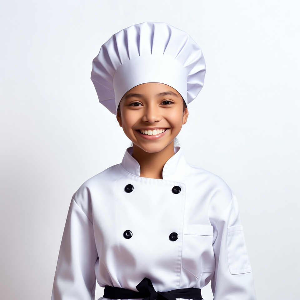 A young Asian girl with a bright smile wears a white chef's hat and matching chef's jacket with black buttons and a waist tie. She stands confidently in front of a plain white background. Her uniform is neatly fitted, emphasizing her playful chef role.