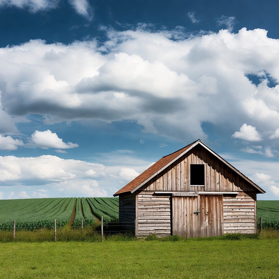 A rustic wooden barn with a red roof stands in a lush green field under a bright blue sky with fluffy white clouds. The barn features a small window and double doors, surrounded by rows of crops in the distance. The scene captures a serene rural landscape with vibrant greenery.