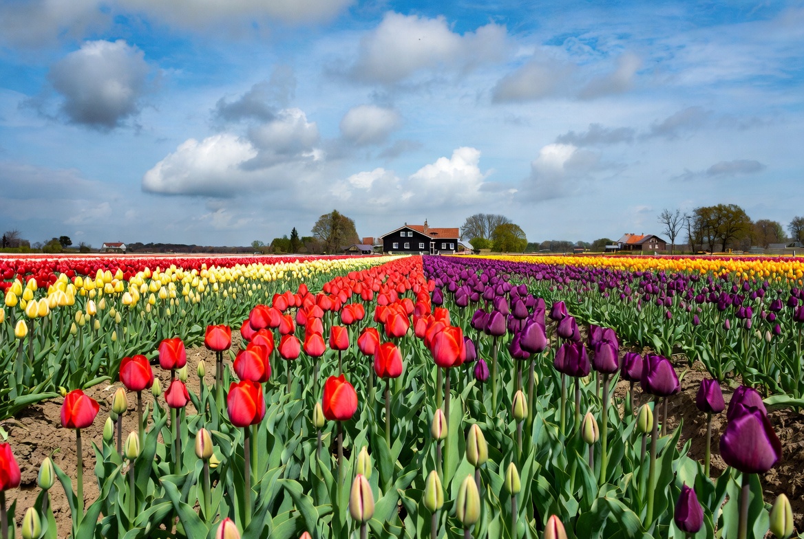 Dutch farmhouse, Netherlands flowers, agriculture, blooming flowers, blue sky, clouds, colorful tulips, farmhouse, fields, floral field, flower field, flower rows, orange tulips, purple tulips, red tulips, rural landscape, spring flowers, trees, tulip farm, tulip fields, vibrant colors, yellow tulips, tulips