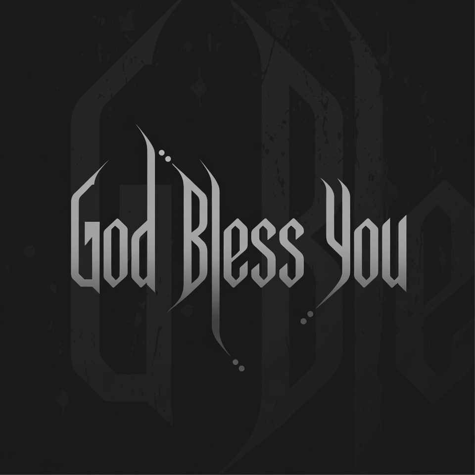 Gothic-style text reading 'God Bless You' appears in elegant silver lettering on a solid black background. The font features sharp, ornate edges and subtle starry accents around the letters. The design is bold and isolated for easy use.