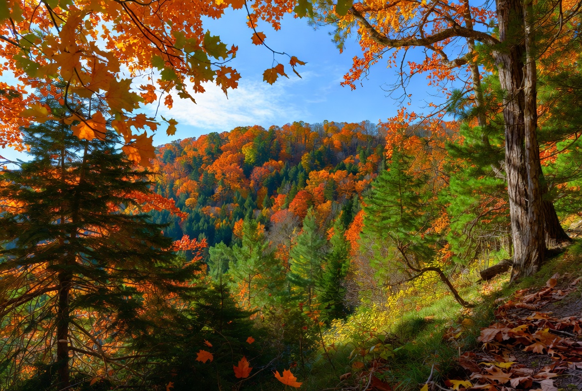 autumn scenery, blue sky, colorful trees, fall colors, fall landscape, foliage, forest hillside, green pines, leaves on ground, nature, orange leaves, outdoors, path, red foliage, trees, vibrant leaves, wooded hill, woodland, yellow trees, autumn forest
