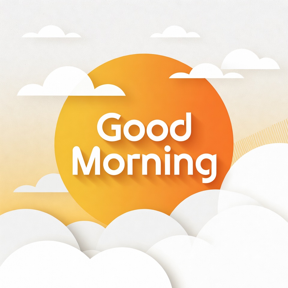 A vibrant illustration features the text 'Good Morning' in bold white letters on an orange sun. Fluffy white clouds float around the sun against a light gradient sky. The design uses a flat, paper-cut style with isolated background.