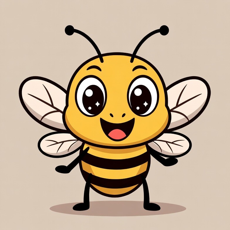 A cheerful yellow cartoon bee with black stripes stands on a plain beige background. It has large sparkling eyes, wide wings, and a big happy smile. The bee's arms are outstretched in a friendly pose.