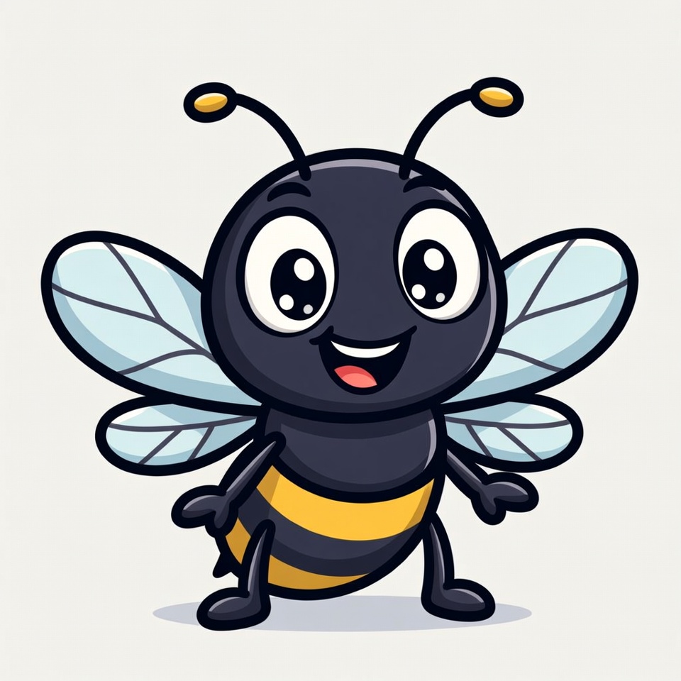 animal character, animated bee, bee, big eyes, black bee, cartoon bee, clipart, cute bee, friendly pose, fun insect, happy bumblebee, illustration, isolated background, kawaii bee, smiling bee, standing bee, transparent wings, vector art, yellow stripes, bumblebee