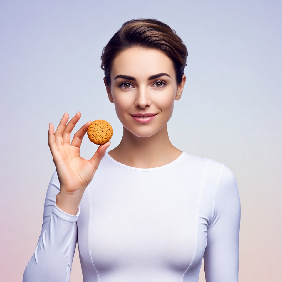 A woman with short brown hair and a subtle smile holds a small golden cookie in her hand. She wears a form-fitting white top and stands against a smooth purple gradient background. Her expression is friendly and inviting.