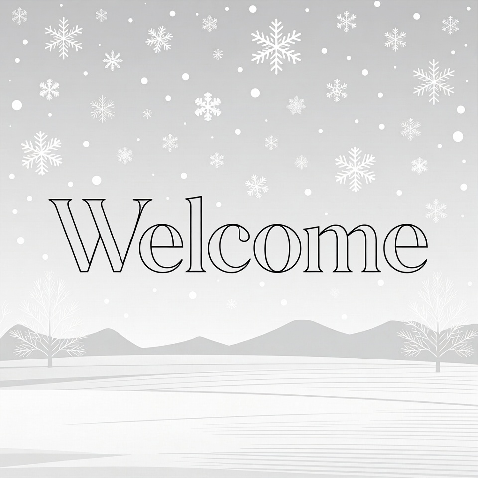 A clipart illustration features the word 'Welcome' in large white outline letters over a snowy gray landscape. Scattered snowflakes fill the sky, with distant gray mountains and bare winter trees visible below. The entire scene is rendered in shades of gray on an isolated background.