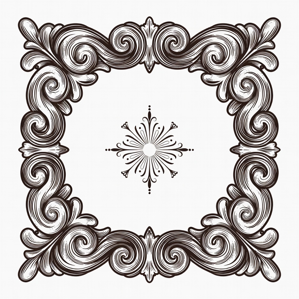 baroque frame, black frame, clipart, decorative border, elegant border, filigree frame, floral border, graphic element, illustration, isolated background, line art, ornamental design, rococo style, scroll design, starburst center, swirling motifs, vector frame, vintage frame, white background, ornate frame