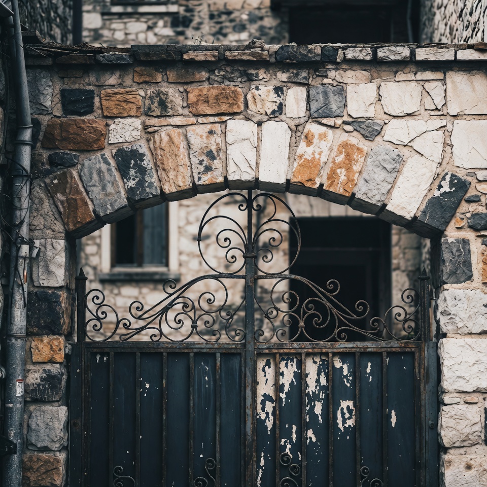 aged wall, arched entrance, arched gate, architecture, black gate, decorative iron, doorway, entrance, floral design, gate design, masonry, metalwork, narrow window, old building, ornate gate, outdoor gate, pipes, rust, rustic architecture, stone arch, stone archway, stone masonry, stone wall, urban architecture, vintage gate, weathered gate, wrought iron, iron gate