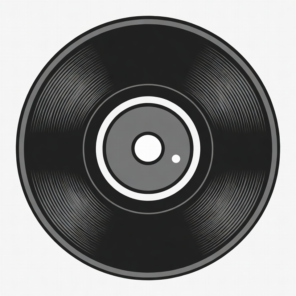 A simple black vinyl record is depicted on a white background. It features a central gray label with a small white dot and concentric grooves radiating outward. The illustration has clean line art style.