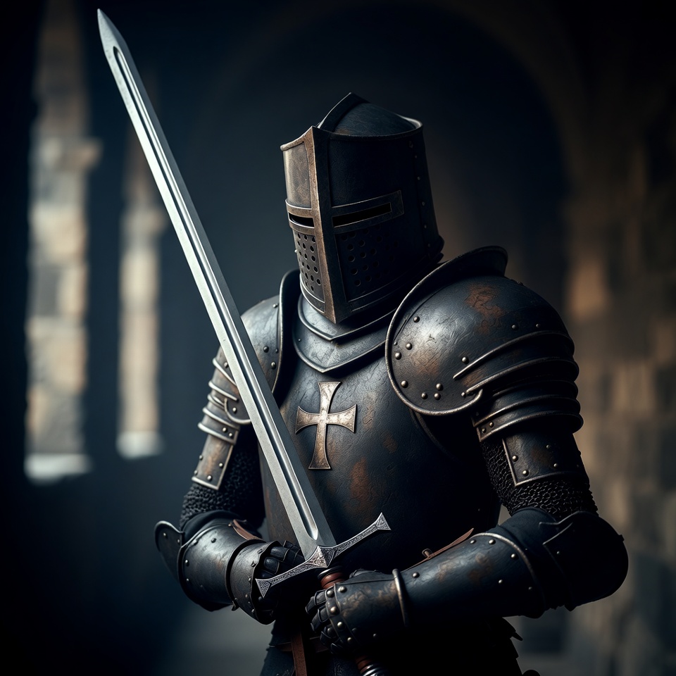 armor, cross, crusader, dark background, fantasy, gauntlets, helmet, isolated background, male, medieval knight, plate armor, standing, steel sword, stone archway, sword, warrior, weapon, knight