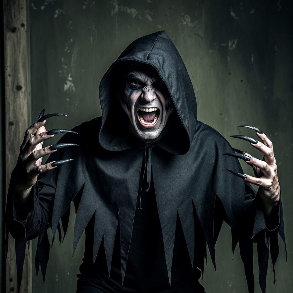 Halloween costume, White, aggressive stance, black cloak, claws, dark background, evil expression, extended hands, green wall, grim reaper, horror, male, menacing pose, sharp nails, snarling face, tattered cloak, white makeup, wooden beams, hooded man