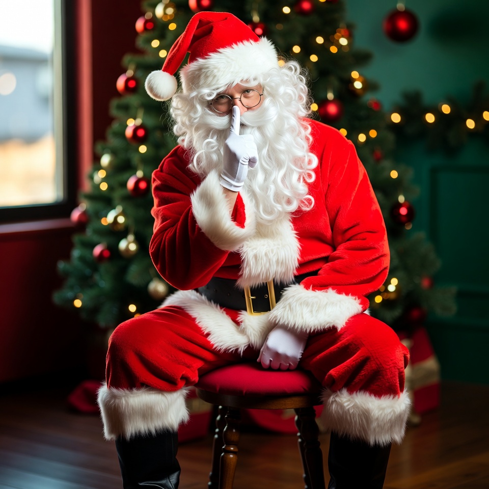 A man dressed as Santa Claus in a red velvet suit with white fur trim sits on a red stool. He has a long white beard, wears round glasses, and presses a gloved finger to his lips in a shushing gesture. A decorated green Christmas tree with lights and ornaments stands behind him in a cozy room with a window.