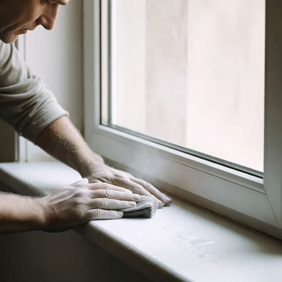 A man with short hair wears a light gray sweater and white gloves while scrubbing a white windowsill with a gray sponge. He leans forward attentively toward the large window with white frame. Dust particles are visible in the air near the sill.