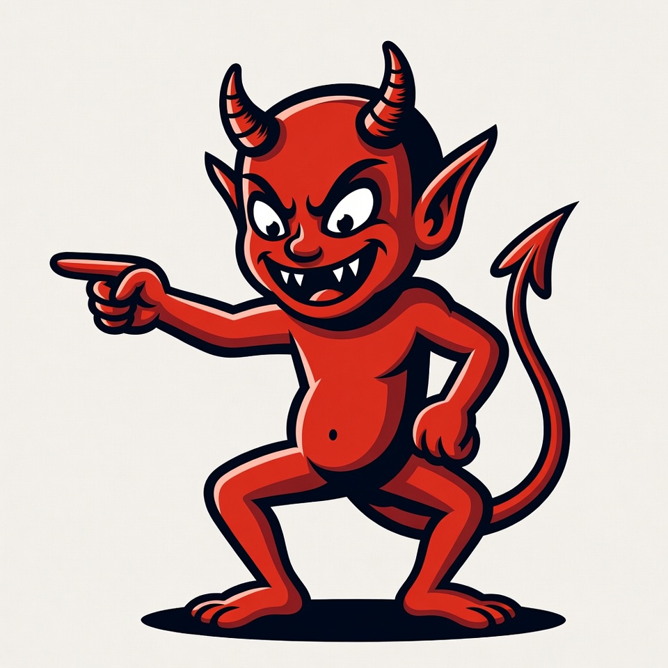 A red cartoon devil with horns, fangs, and a tail stands on two legs in a dynamic pose. It points one finger forward with a menacing expression and sharp claws. The illustration features a simple isolated white background.