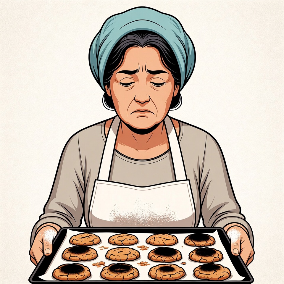 An illustrated woman with a blue headscarf and white apron holds a baking sheet of burnt cookies. She has a sad, frowning expression with downturned eyes. The image features a simple white background.