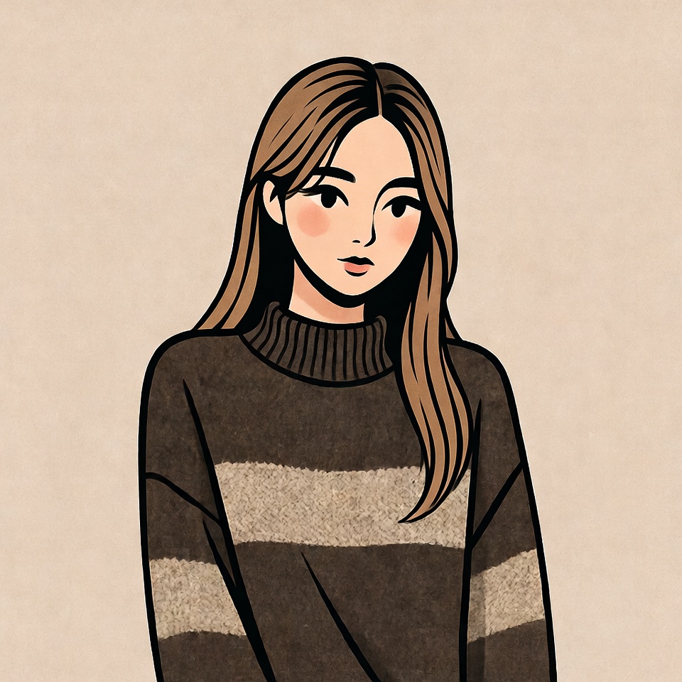 An illustration of a young Asian woman with long brown hair and pink cheeks stands against a beige background. She wears a brown and beige striped turtleneck sweater with long sleeves. Her expression is calm with large expressive eyes.