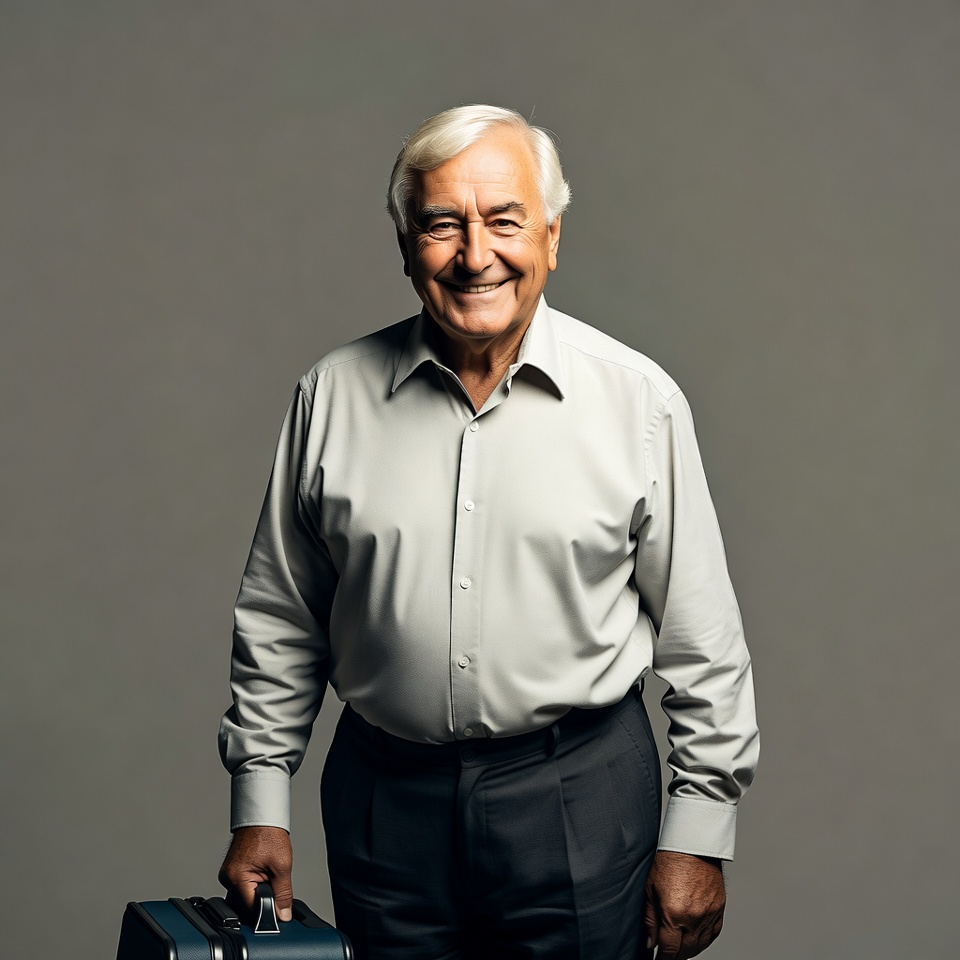 An elderly White man with white hair smiles warmly while standing against a gray background. He wears a light gray button-up shirt and dark trousers. He holds a black briefcase in his right hand.