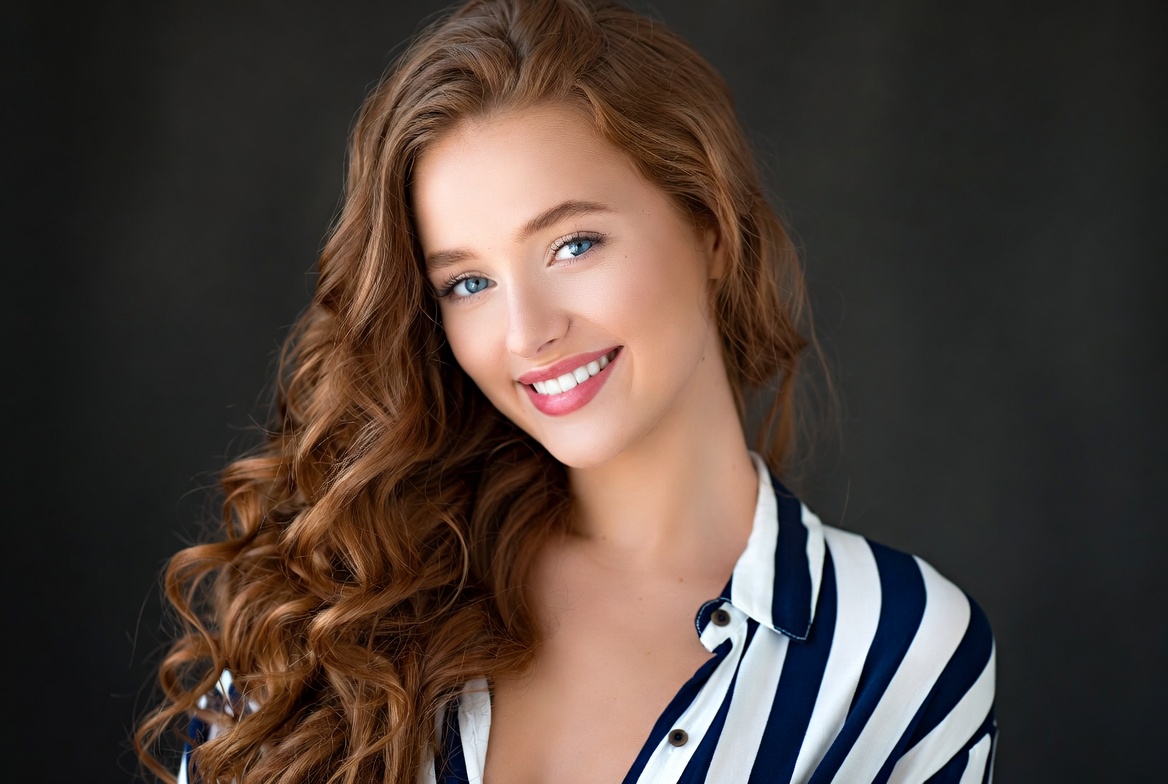 beautiful, blue eyes, cleavage, closeup, dark background, fashion, female, headshot, lips, makeup, portrait, red hair, smiling, striped shirt, wavy hair, young woman, woman