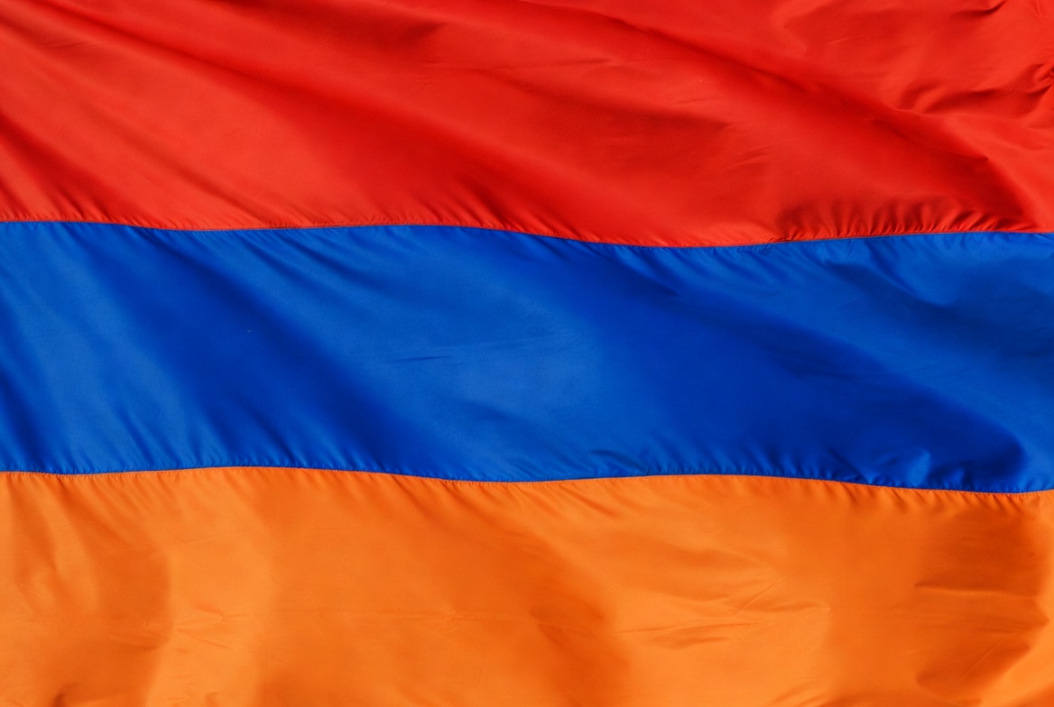 A close-up view of the Armenian national flag waving with three horizontal stripes. The top stripe is red, the middle is blue, and the bottom is orange. The fabric shows folds and texture against a white background.