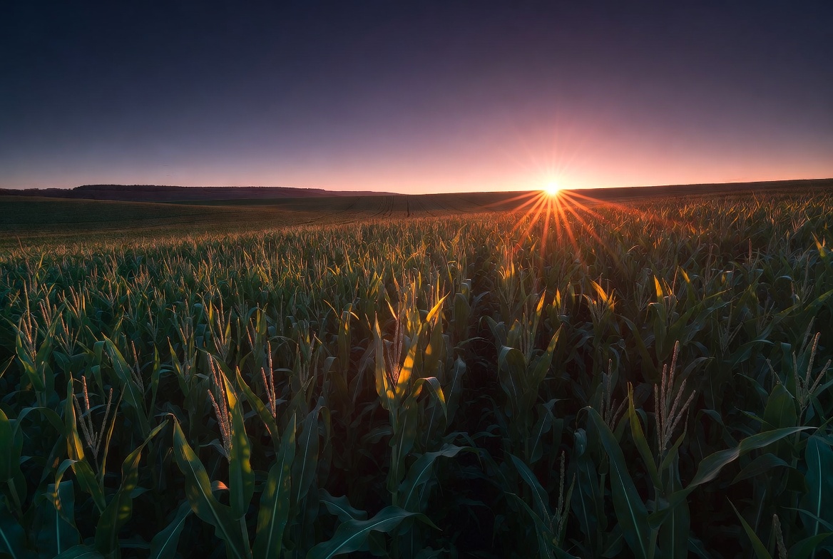 agriculture, blue sky, corn stalks, cornfield, crops, dawn, dusk, evening light, farm, farmland, field, golden hour, harvest, hills, maize, nature, orange sky, outdoors, rural landscape, sky, sun rays, sunlight, sunrise, sunset, corn field