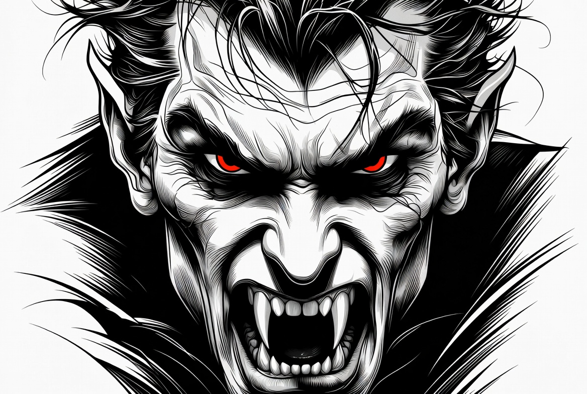 black and white, dark collar, dracula, fangs, fantasy creature, fierce, gothic, horror, illustration, isolated background, line art, male, man, menacing face, monster, pale skin, red eyes, sharp teeth, snarling, supernatural, wild hair, vampire