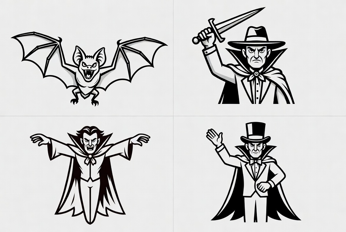 A set of four black and white clipart illustrations on a light gray background features Halloween-themed designs. Two images show bats with spread wings and fangs, while the other two depict men dressed as Dracula with capes, top hats, and menacing expressions, one holding a sword. The illustrations are simple line art suitable for coloring or stickers.