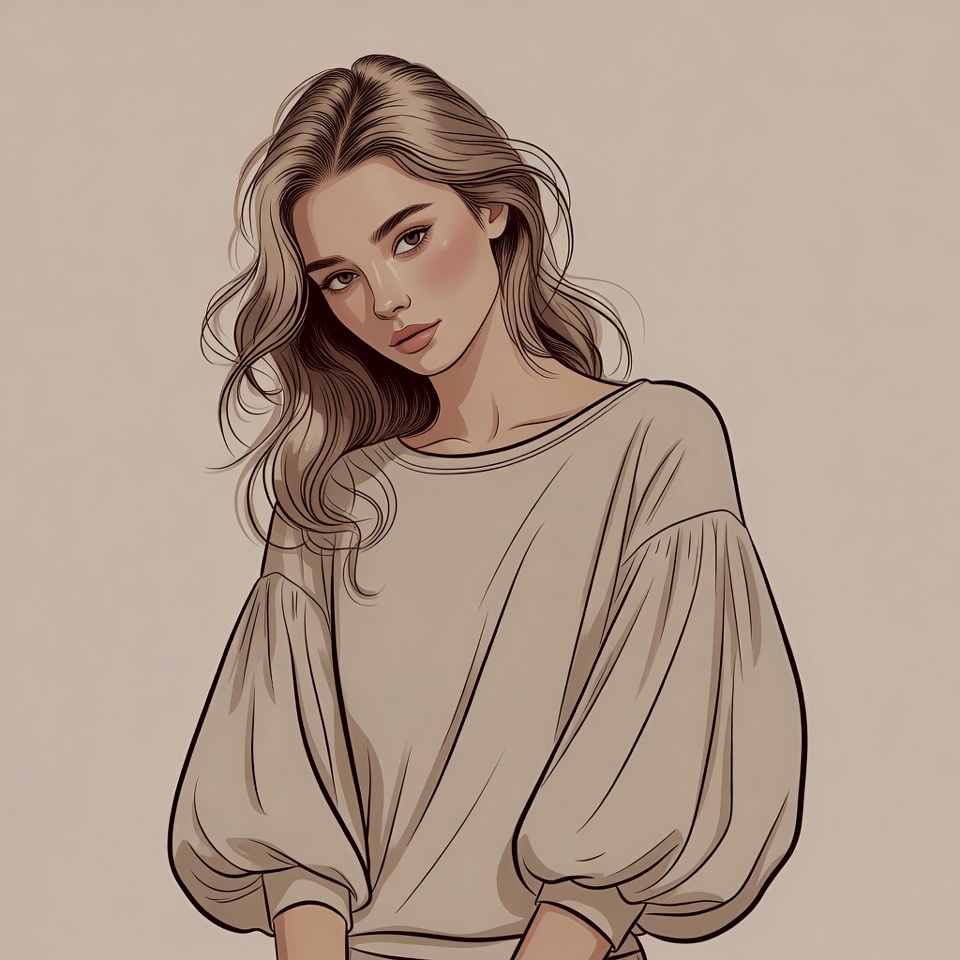 Digital illustration of a young woman with long wavy blonde hair and subtle makeup, gazing to the side. She wears a beige top with voluminous puffy sleeves and a boat neckline. The figure is centered on a plain beige background.