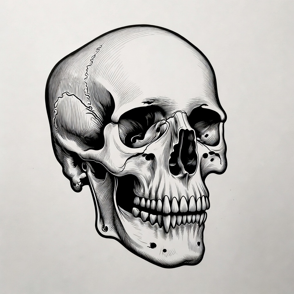 anatomy, artistic skull, black and white, bone structure, clipart, crosshatching, death symbol, detailed skull, human skull, ink drawing, isolated background, realistic skull, skeleton, skull illustration, skull