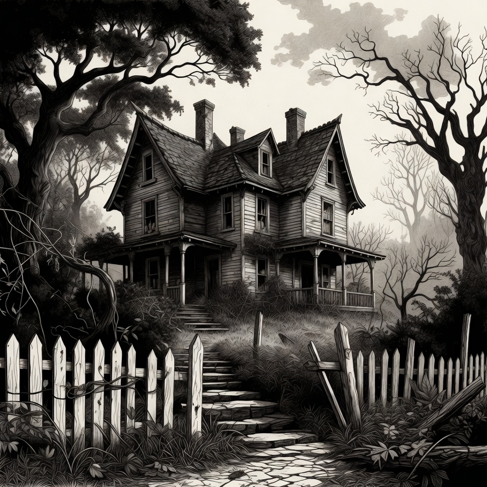 Halloween, Victorian house, abandoned house, bare trees, black and white, chimney stacks, dark forest, dilapidated building, eerie, foggy atmosphere, gabled roof, gothic architecture, illustration, ink illustration, overgrown grass, picket fence, porch steps, spooky mansion, stone path, twisted branches, haunted house