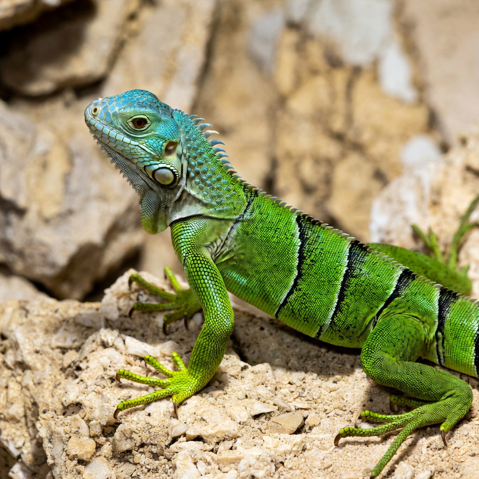 A vibrant green iguana with blue facial markings and striped body sits on a rocky surface. Its spiky crest and claws are prominent against the textured stone background. The lizard gazes forward with detailed eyes and scales.