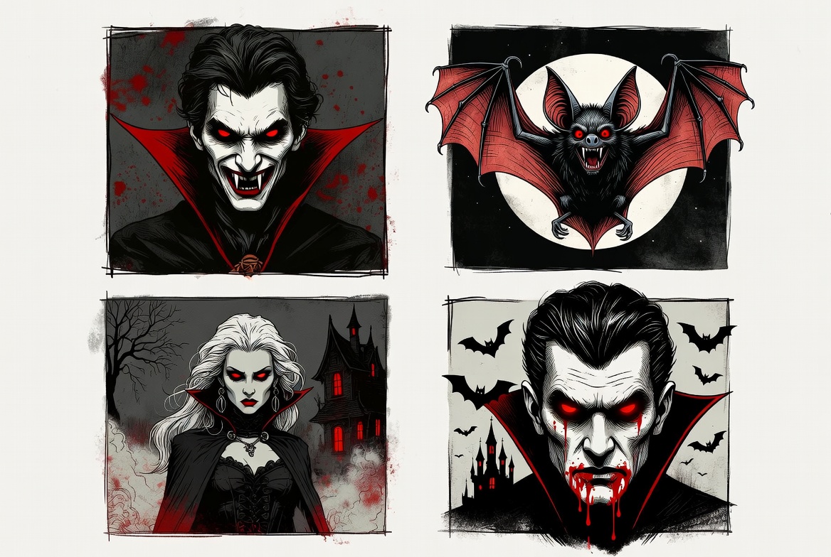 A digital illustration features four panels with Halloween-themed artwork. The top left shows a male vampire with black hair, red eyes, and fangs in a red cape. The top right depicts a red bat with wings spread under a moon, while the bottom left portrays a female vampire with long white hair and a black dress near a haunted castle, and the bottom right displays another male vampire surrounded by bats.
