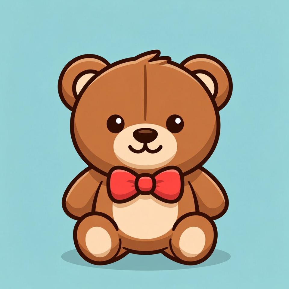 A cute cartoon teddy bear with brown fur and big sparkling eyes sits on a light blue background. It wears a bright red bowtie around its neck and has a friendly smile. The illustration features clean lines and a kawaii style.