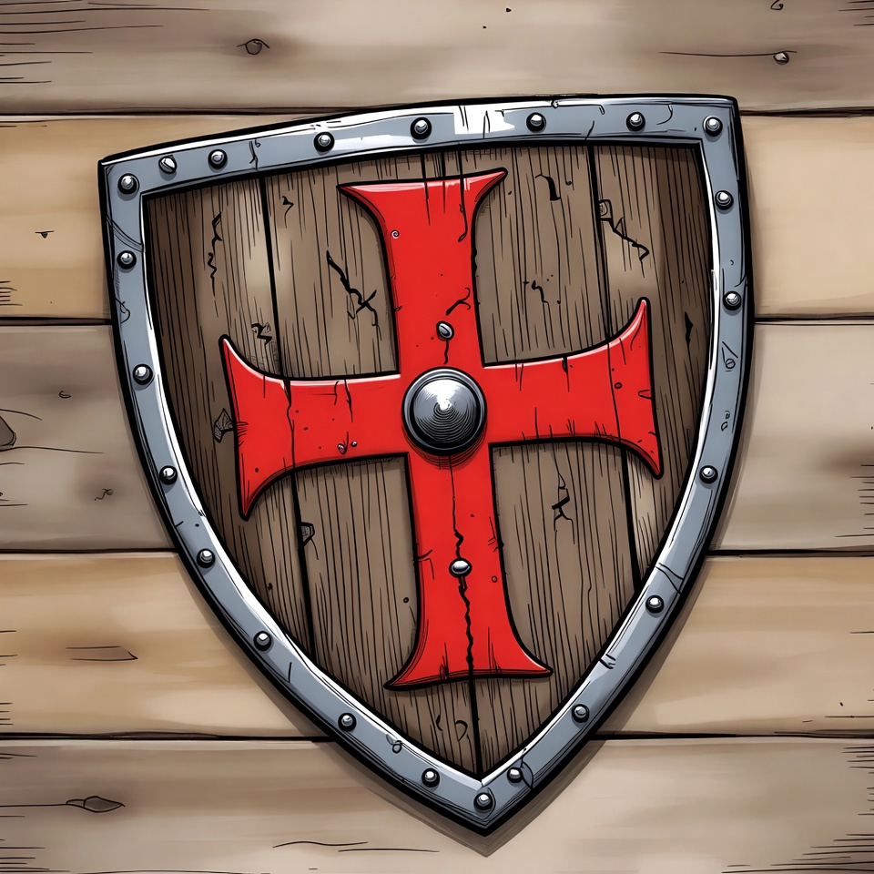 armor, cartoon, clipart, crusader shield, heraldry, illustration, isolated background, knight shield, medieval shield, metal edges, red cross, rivets, wooden background, shield