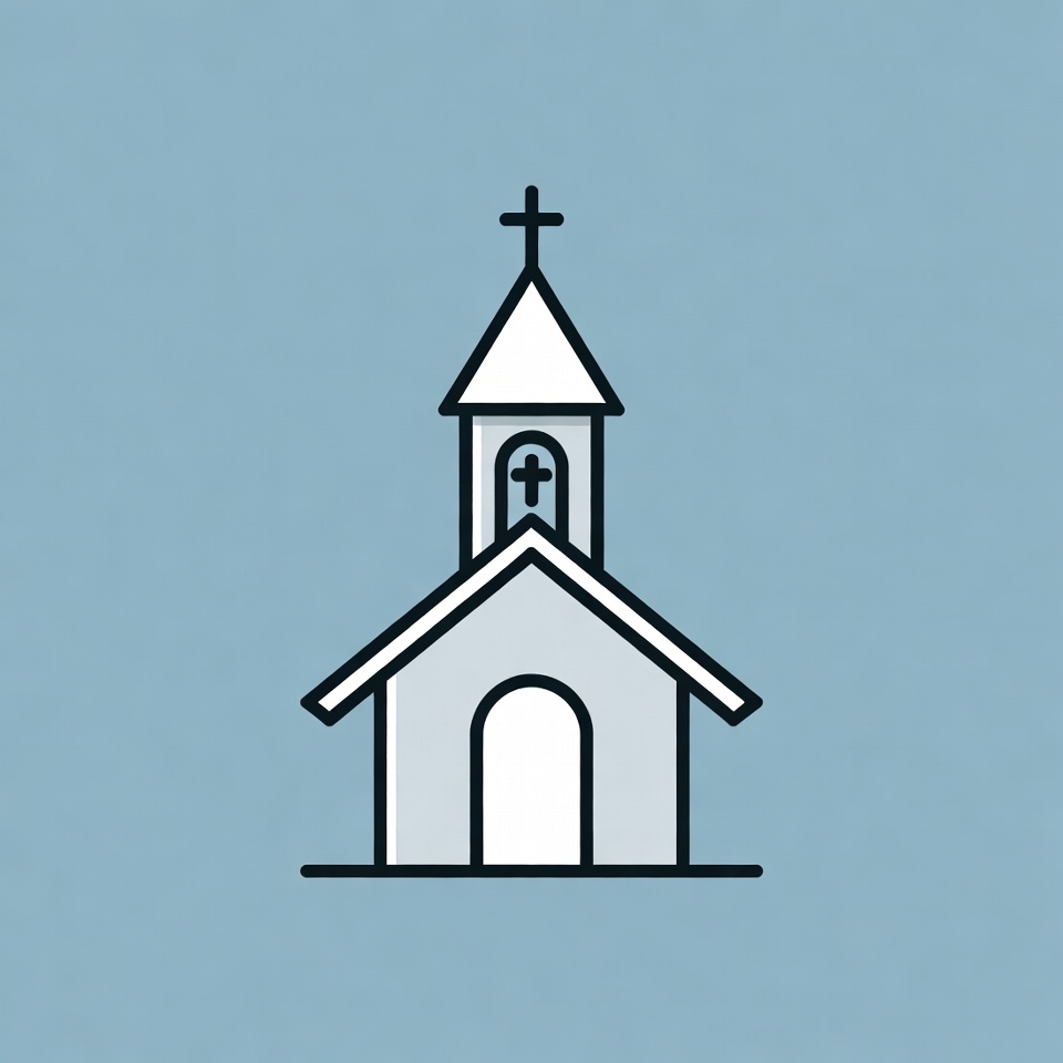 A simple line drawing of a church features a tall steeple with a cross on top and another cross on the tower. The church has a gabled roof, an arched doorway, and is depicted in white outlines against a solid blue background. It is a minimalist vector illustration suitable for icons.