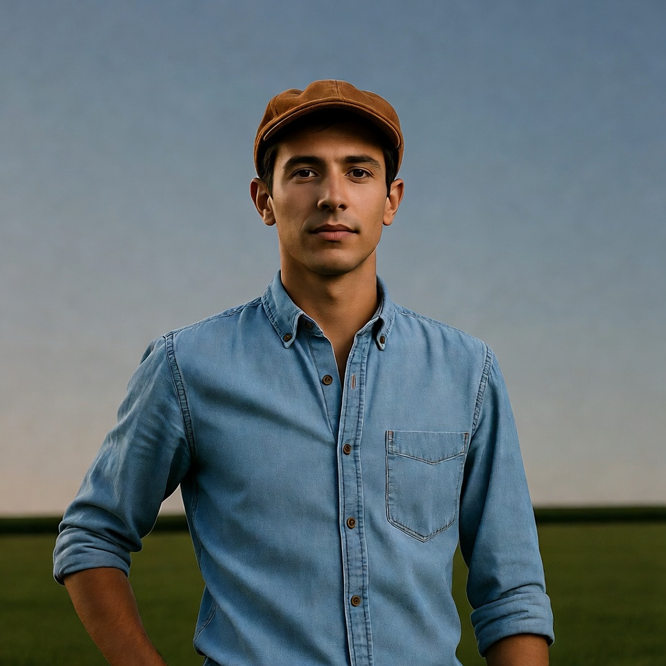 Latino, arms crossed, blue shirt, blue sky, brown cap, button-up shirt, casual attire, dark hair, denim shirt, flat cap, grassy field, green grass, male, outdoors, portrait, serious expression, short hair, standing, young man, man