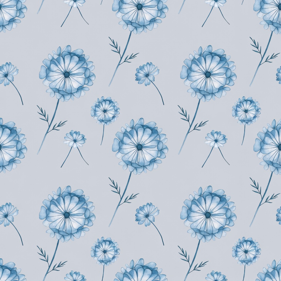 blue daisies, botanical pattern, daisy flowers, delicate petals, floral design, floral pattern, flower cluster, flower illustration, green stems, light gray background, repeating pattern, seamless pattern, watercolor art, watercolor pattern, blue flowers