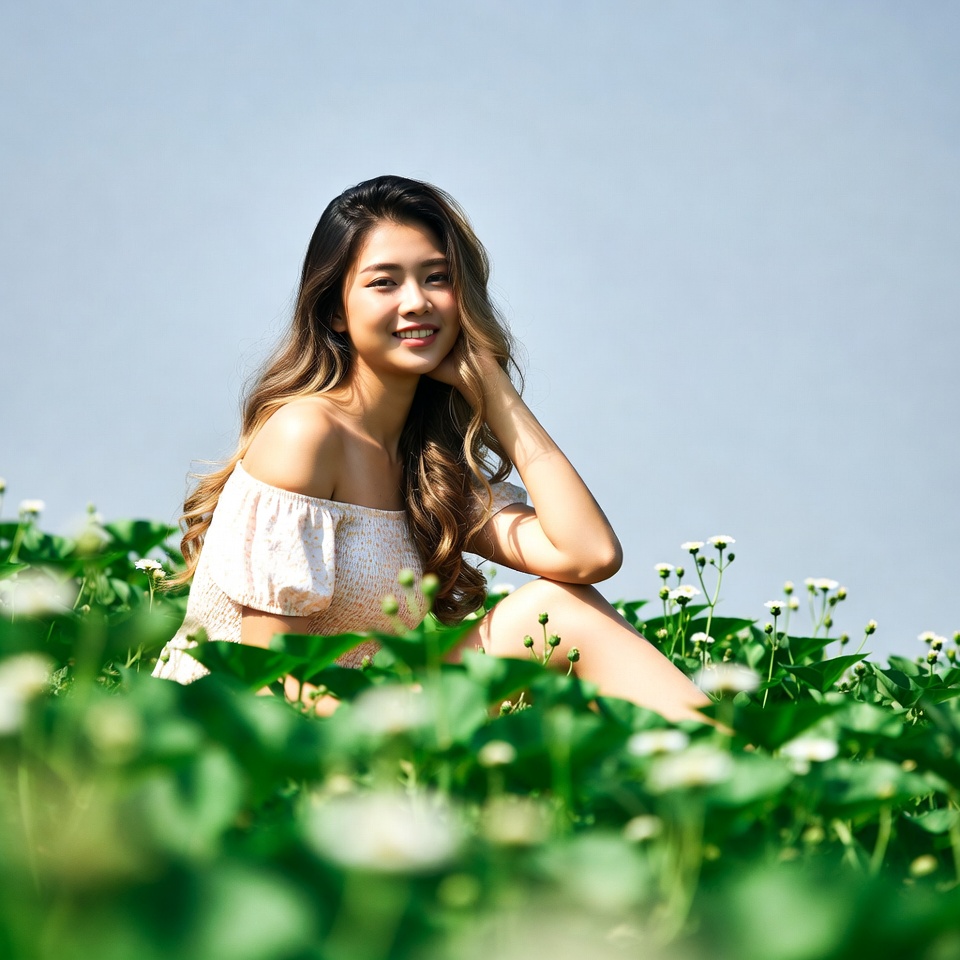 A young Asian woman with long wavy hair smiles while sitting in a lush green field filled with white flowers. She wears an off-shoulder pinkish top with floral patterns and touches her face gently. The background features a clear blue sky.