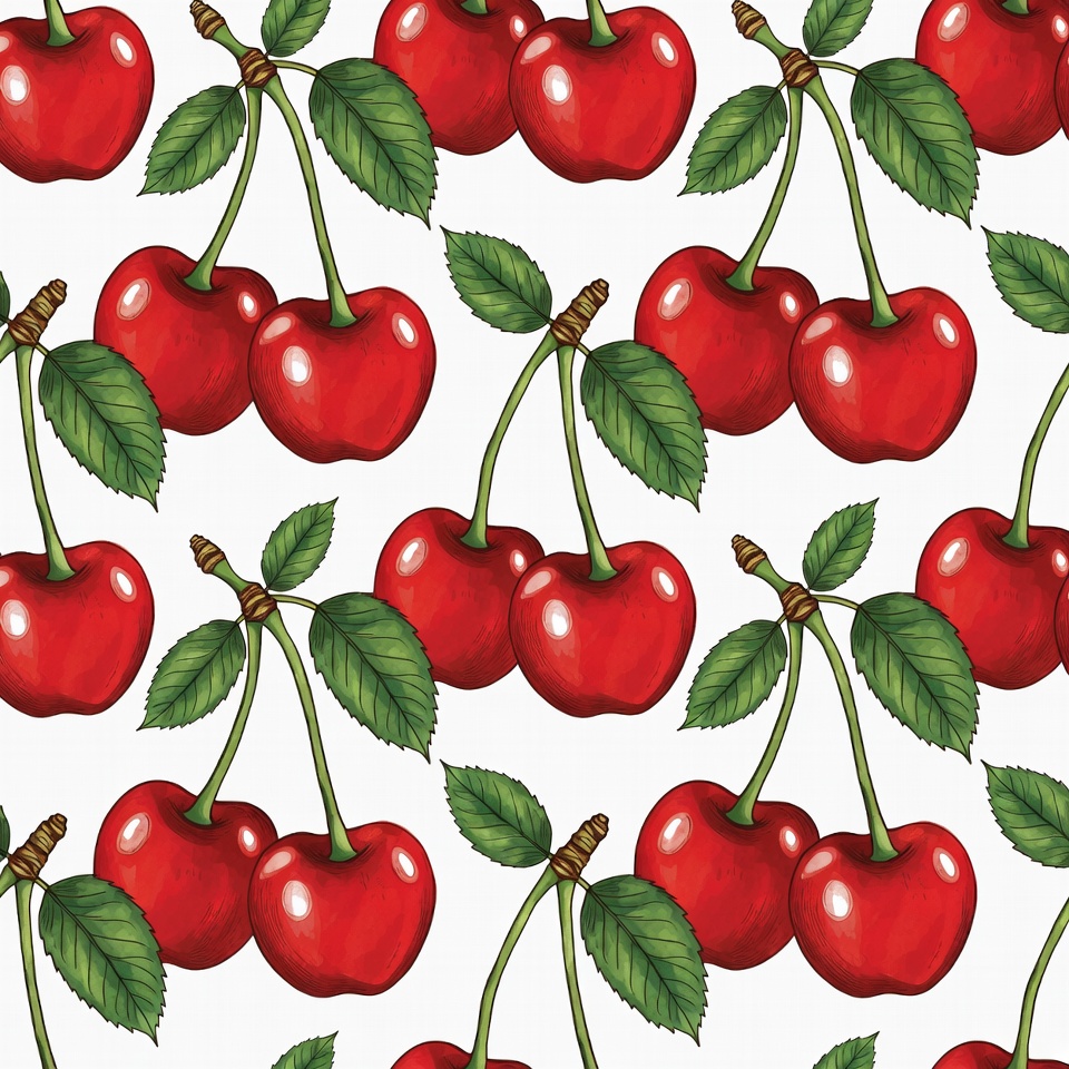 A seamless pattern features clusters of shiny red cherries with green leaves and stems on a white background. The cherries are illustrated in a repeating tile design. Each cluster shows ripe cherries hanging from short stems.
