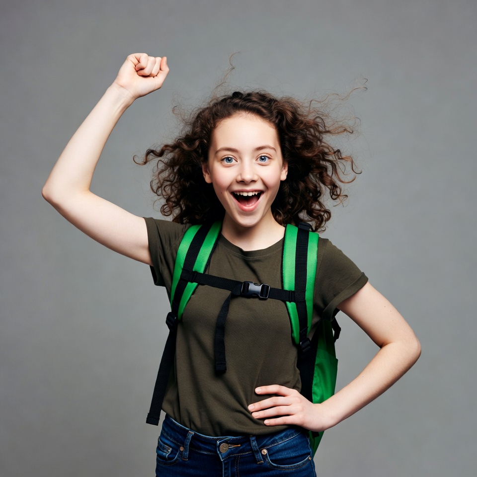 A young girl with curly hair smiles widely and raises her right fist in excitement while wearing a green backpack. She has on a short-sleeved green t-shirt and jeans, standing against a plain gray background. Her hair flows dynamically as she poses energetically.