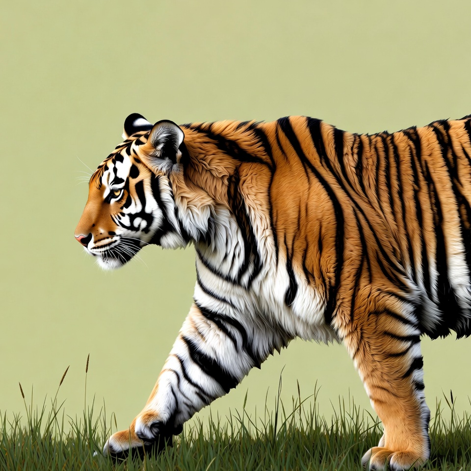 animal illustration, big cat, black stripes, detailed fur, grass field, green background, orange tiger, predator, realistic tiger, side profile, striped fur, walking tiger, wild animal, wildlife, tiger