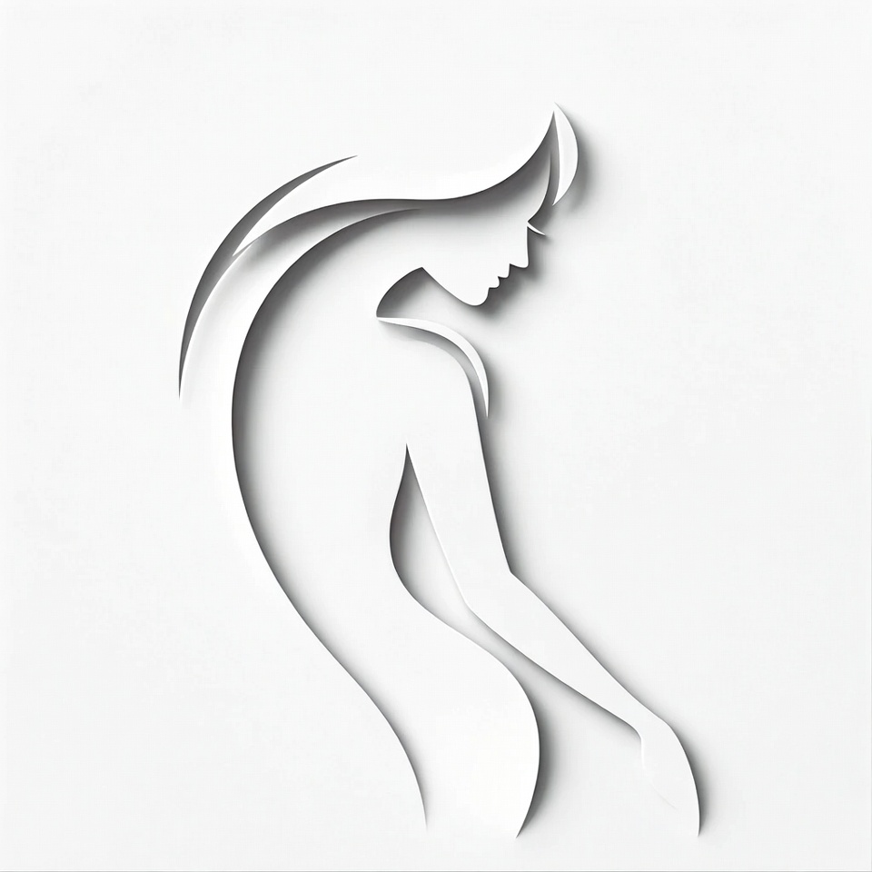 A minimalist white paper cutout illustration depicts the side profile of a woman with flowing long hair. Her elegant silhouette shows a graceful neck, shoulders, and arm extended downward. The design is set against a plain white background with layered cutout effects.