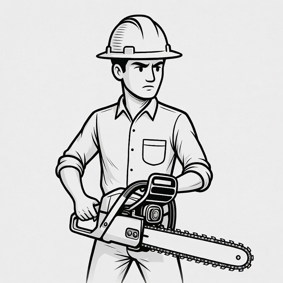 A cartoon illustration of a man with short hair wearing a white hardhat, white shirt, and pants stands holding a large chainsaw across his body. He has a stern expression and is depicted in black line art on a white isolated background. The chainsaw features a long bar and chain, gripped firmly by both hands.