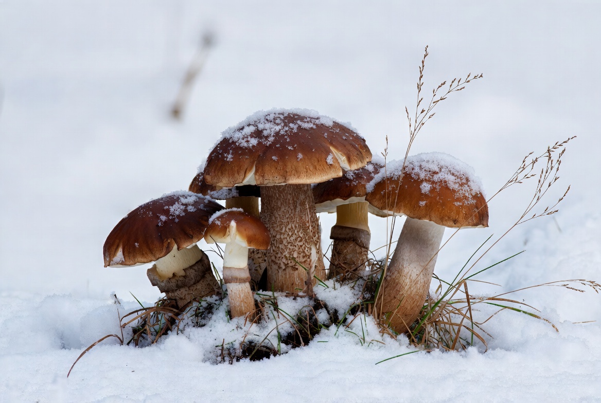 Snowy Brown Mushrooms in Winter Grass