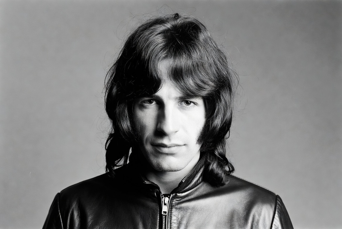 1970s style, White, black and white, black jacket, headshot, leather jacket, long hair, male, monochrome, portrait, rock musician, serious expression, studio photo, wavy hair, man