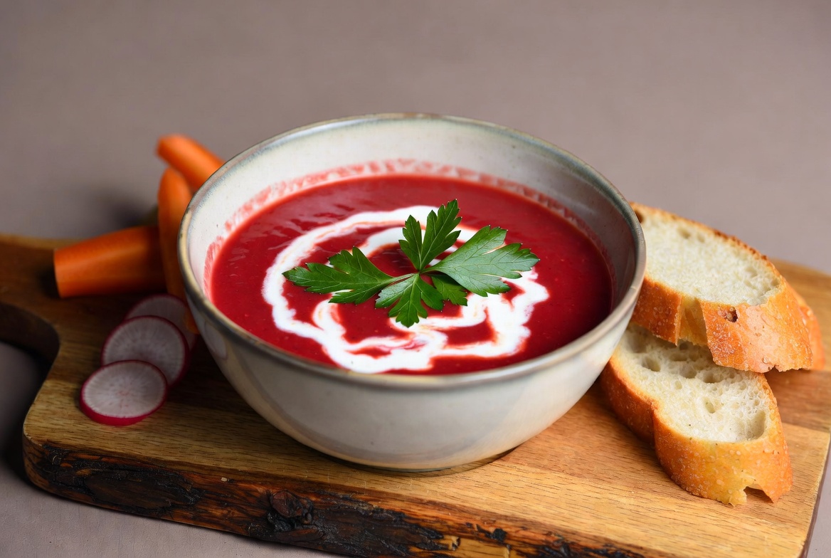 A bowl of vibrant red beet soup garnished with a swirl of white cream and fresh parsley sits on a wooden board. Slices of crusty bread, carrot sticks, and radishes are arranged beside the bowl. The soup is served in a white ceramic bowl against a neutral background.