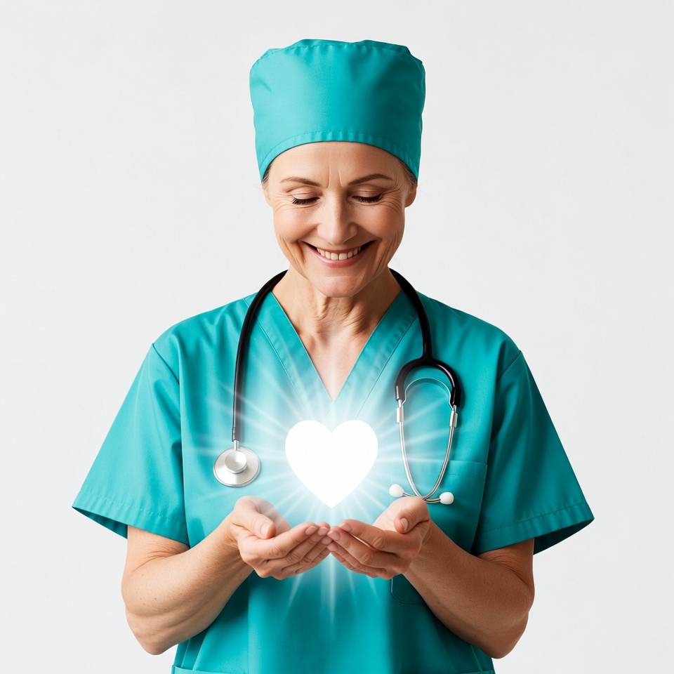 A mature White woman dressed in teal scrubs and nurse cap holds a glowing white heart in her hands. She wears a stethoscope around her neck and smiles warmly at the heart. The image is isolated on a white background.