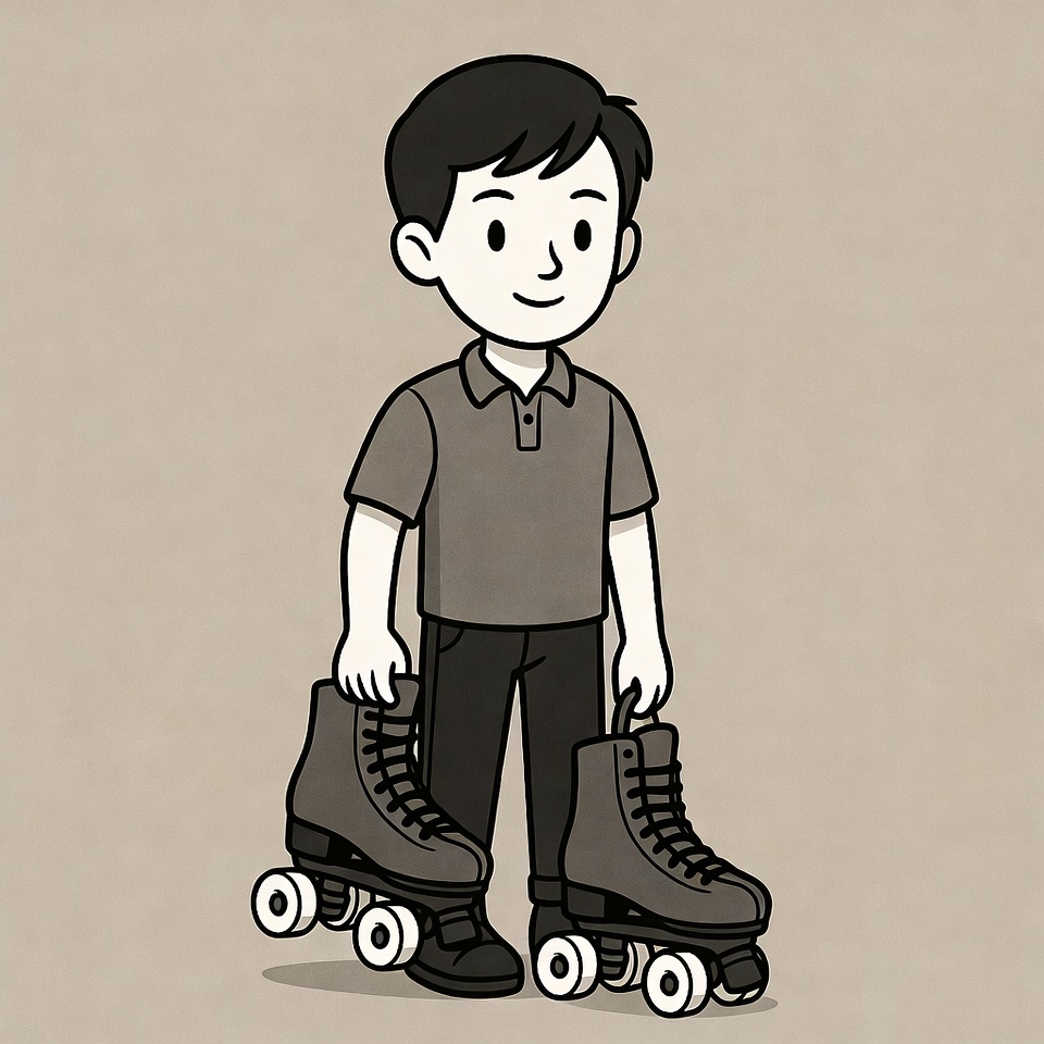 A cartoon boy with short black hair stands smiling while holding a pair of black roller skates in his hands. He wears a collared short-sleeve shirt and pants. The illustration features a simple beige background with black line art.